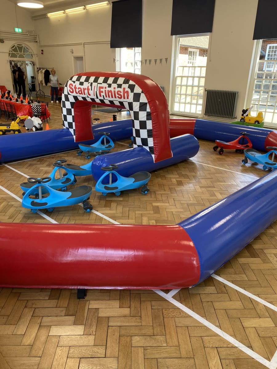 Are you searching for a show-stopping attraction to elevate your next party or event? Look no further! Our inflatable race track Blue & red inflatable Race track & 8 wiggle cars in London & Hertfordshire is guaranteed to wow your guests and keep children entertained for hours. Perfect for birthday parties, summer fairs, christenings, and family gatherings, this vibrant inflatable race track brings exhilarating fun and friendly competition to any occasion.